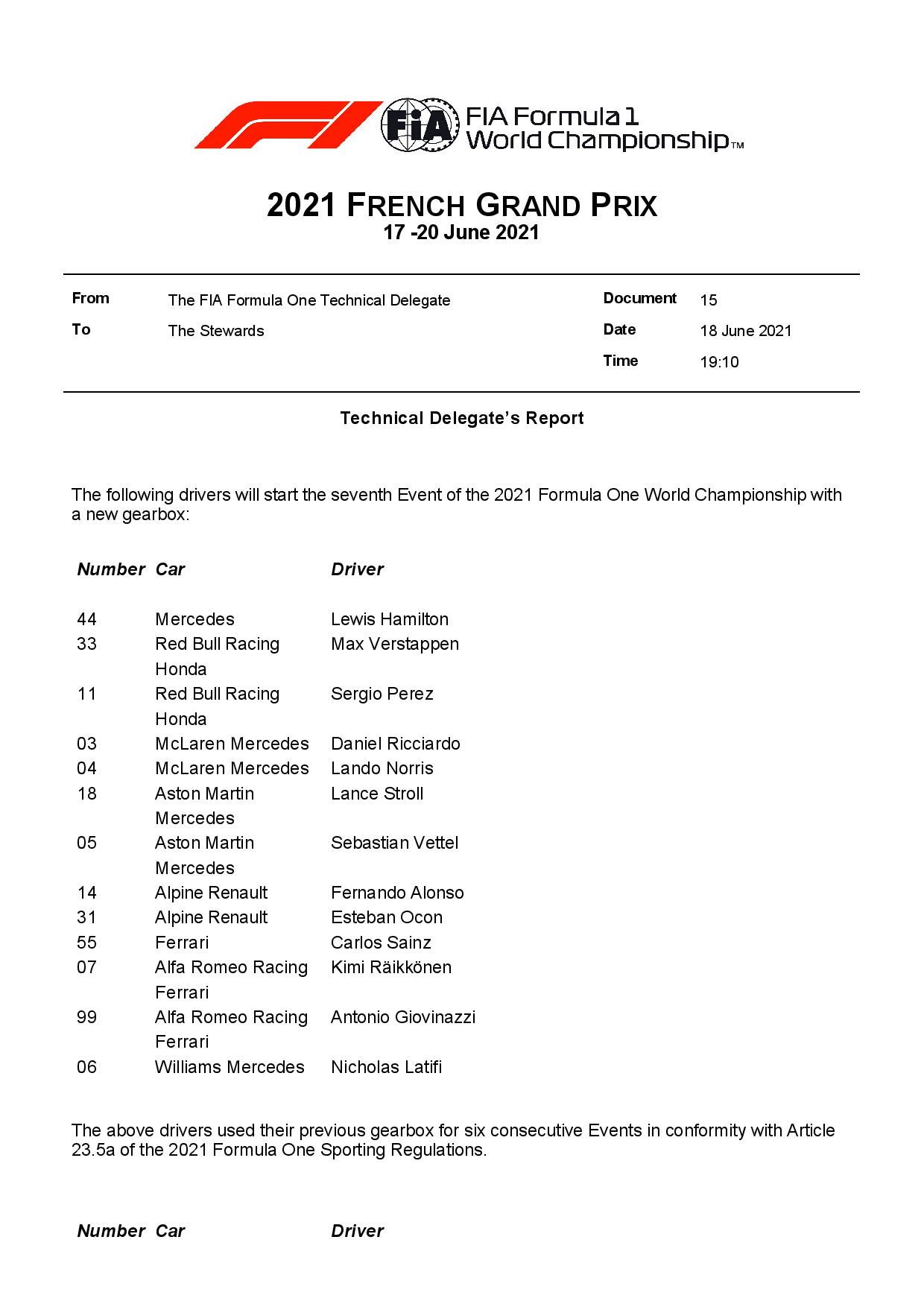 Lewis Hamilton, Max Verstappen, Sergio Perez, Daniel Ricciardo, Lando Norris, Lance Stroll, Sebastian Vettel, Fernando Alonso, Carlos Sainz, Kimi Raikkonen, Antonio Giovinazzi et Nicholas Latifi ont tous reçu une boîte de vitesse neuve et n’écoperont d’aucune pénalité sur la grille de départ du Grand Prix de France ce dimanche.