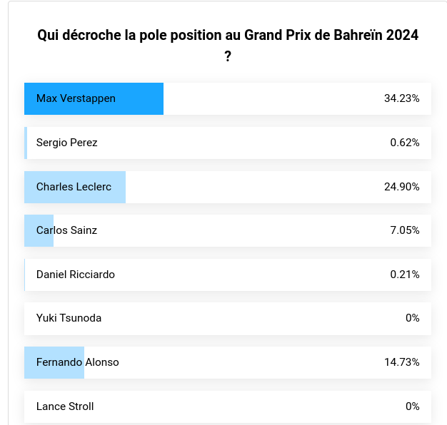 Vous n’avez absolument rien à gagner en participant à ce vote, il s’agit uniquement d’obtenir une tendance avant chaque séance de qualifications tout au long de la saison et voir si les résultats obtenus se traduisent ensuite en piste lors de la séance qualificative.