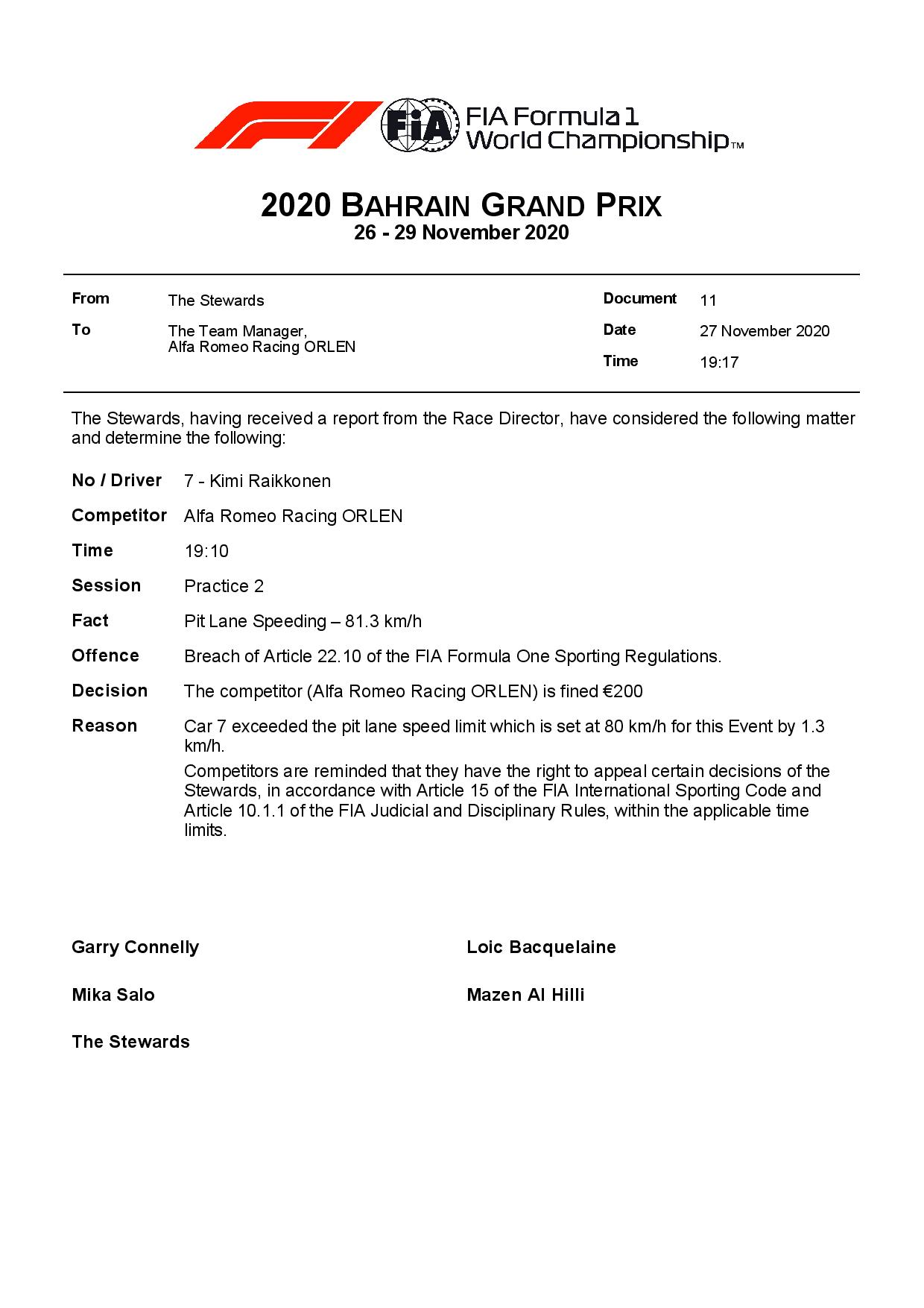 L’équipe Alfa Romeo Racing a écopé d’une amende ce vendredi au Grand Prix de Bahreïn à la suite d’une infraction commise par Kimi Raikkonen lors de la seconde séance d’essais libres.