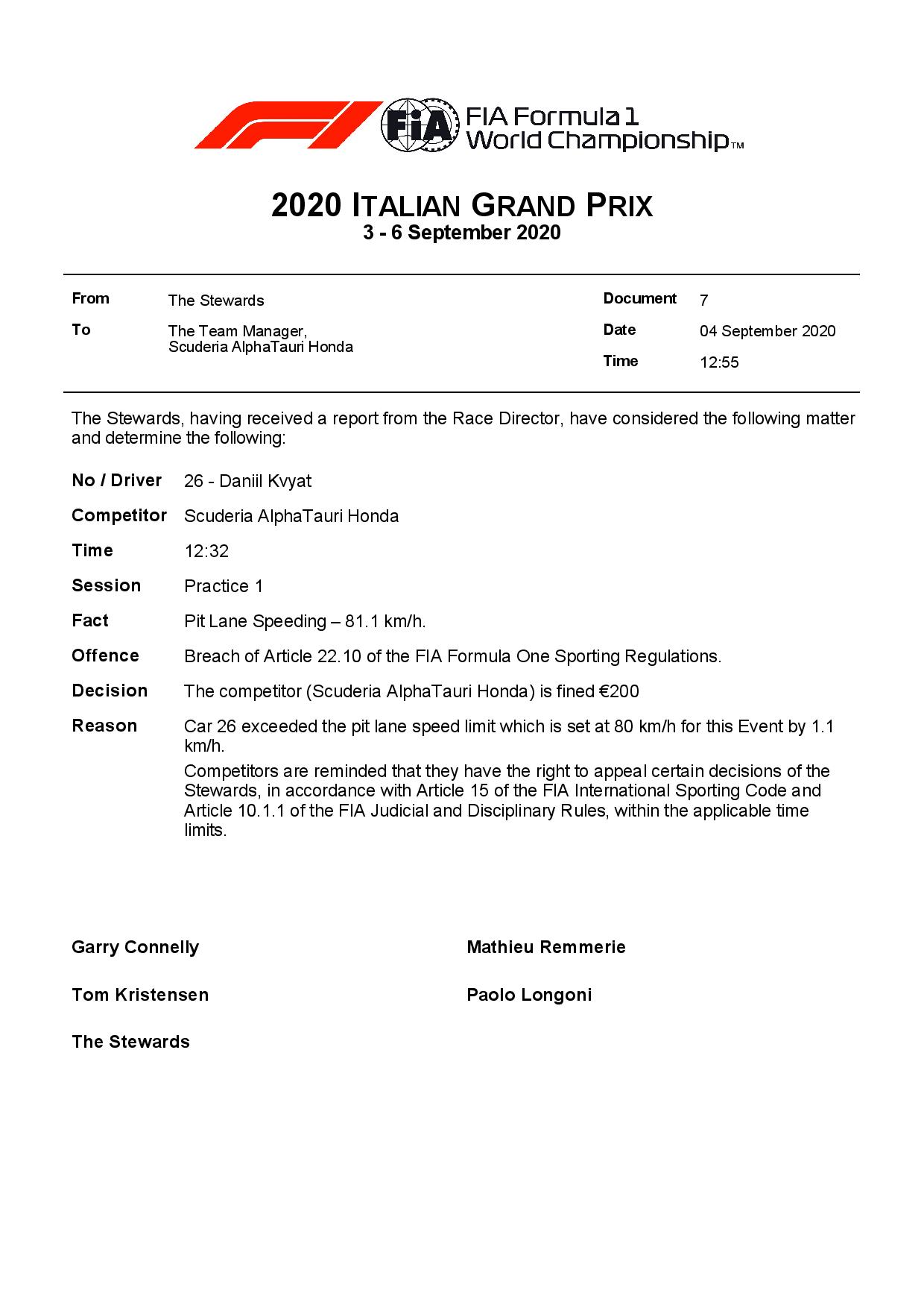 L’équipe AlphaTauri a écopé d’une amende au Grand Prix d’Italie après une infraction constatée par les commissaires de course ce vendredi en essais libres 1 à Monza.