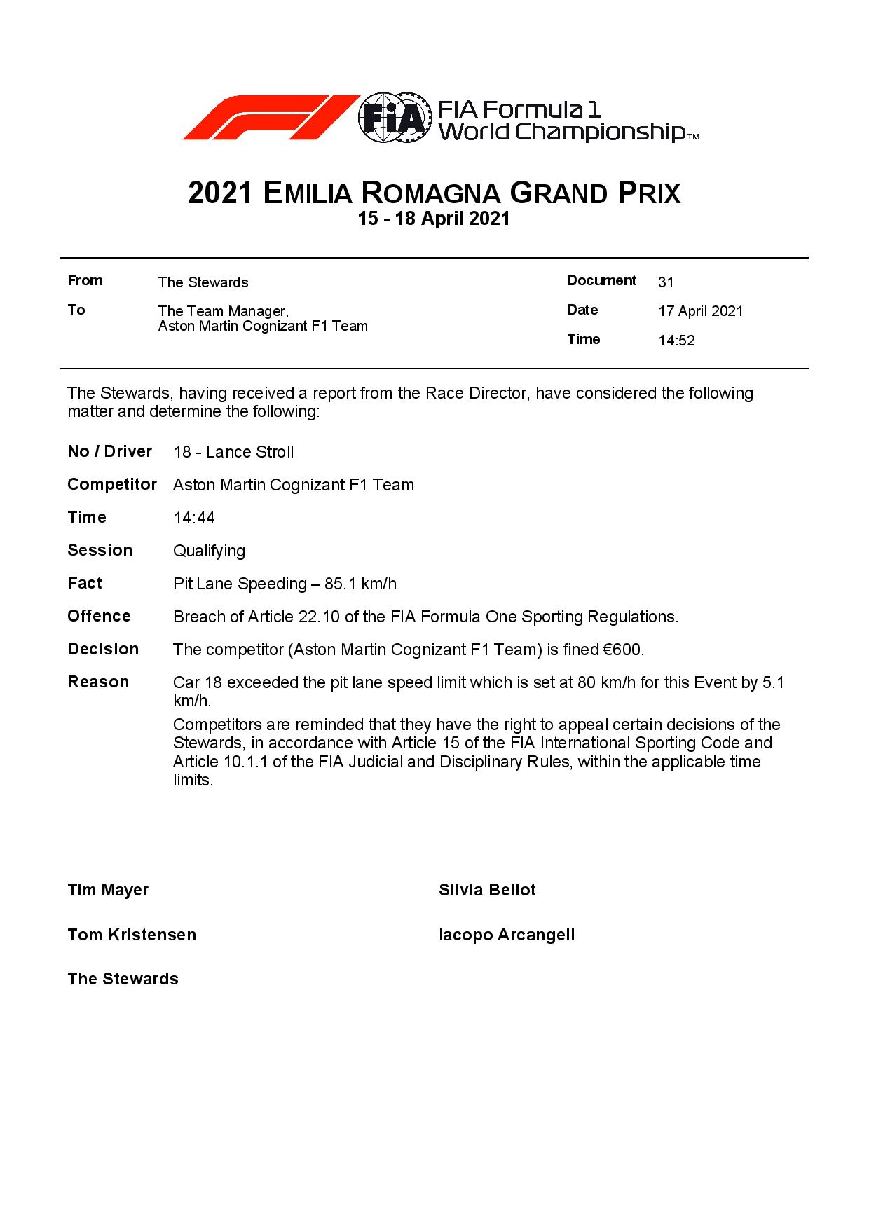 L’équipe Aston Martin a écopé d’une amende ce samedi à Imola à l’issue de la séance de qualifications du Grand Prix d’Émilie-Romagne.