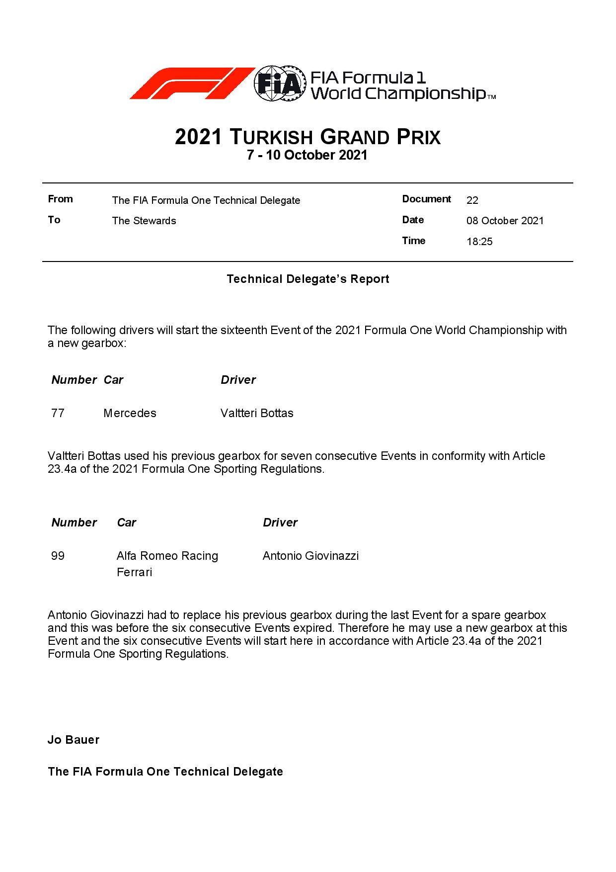 Le pilote Mercedes Valtteri Bottas et le pilote Alfa Romeo Antonio Giovinazzi débutent le week-end du Grand Prix de Turquie avec une boîte de vitesses neuve montée sur leur monoplace.