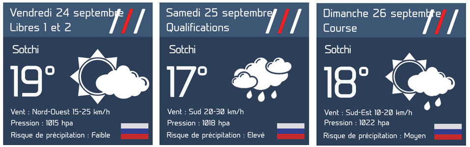 Situé sur les bords de la Mer Noire et plus exactement sur les anciennes installations olympiques de la ville de Sotchi, le tracé russe, qui se déploie sur 5.848 Km, est un enchaînement de longues lignes droites et de virages rapides. C’est l’un des circuits les plus longs et un des plus rapides du calendrier.