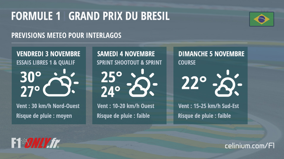 Pour la course de dimanche, dont le départ sera donné à 14h heure locale (18h heure de Paris), les conditions seront agréables, tout au long des 71 tours que comporte la manche brésilienne, avec un ciel peu nuageux et un mercure à 22°C. Le vent sera encore présent (entre 15 et 25 km/h) mais de secteur Sud-Est cette fois-ci et avec des rafales pouvant atteindre 35 km/h. Le risque de précipitation est faible mais l’indice UV proche de 11 ce qui ne manquera pas de chauffer le bitume du circuit.
