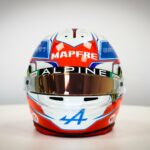 La tour Eiffel, chère au pilote français, est toujours présente sur le sommet du casque, tandis que le logo d’Alpine est fièrement représenté sur la mentonnière à l’avant.
