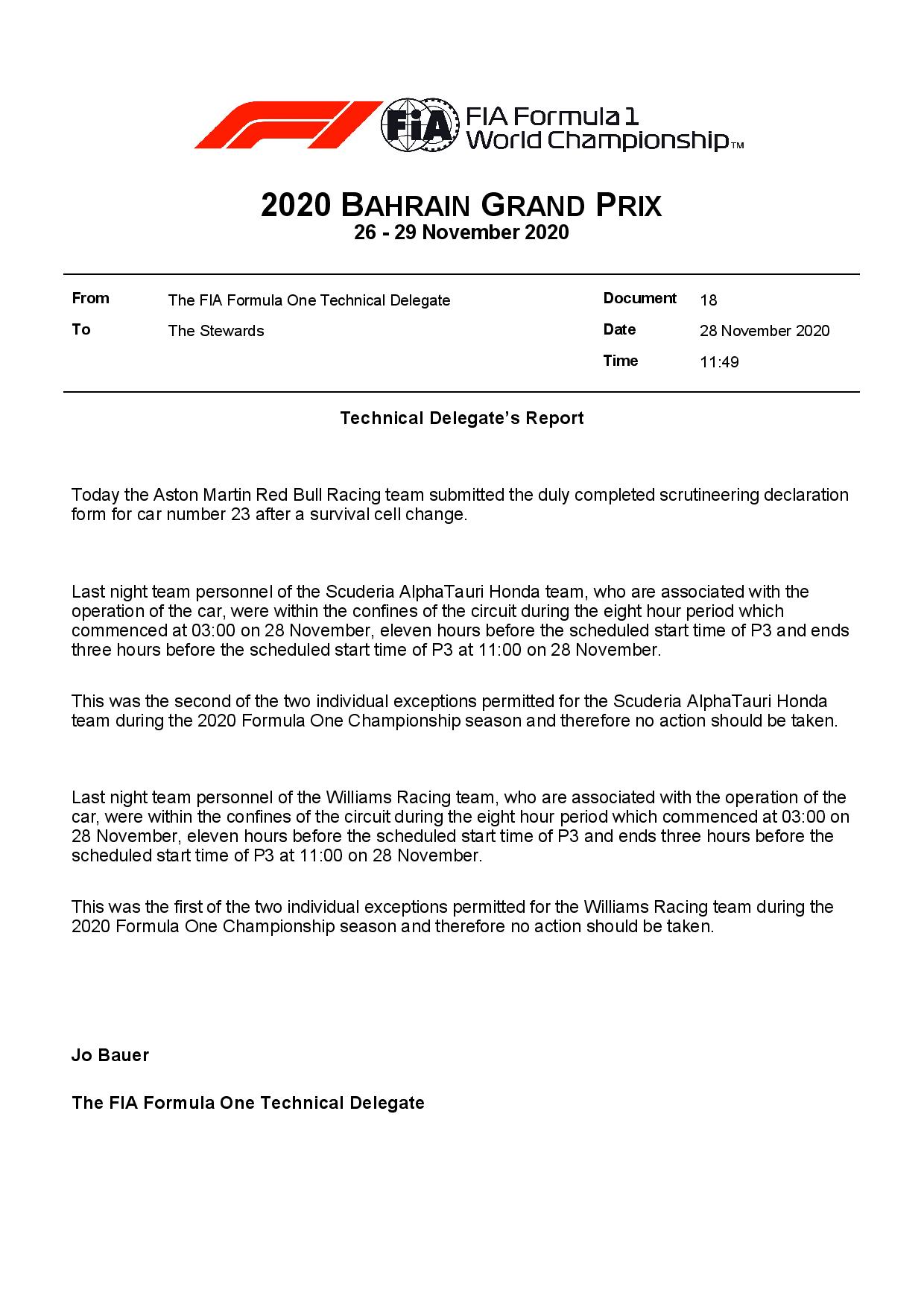 Outre ce changement de châssis, la FIA nous indique ce samedi que les équipes AlphaTauri et Williams ont enfreint le couvre feu obligatoire dans la nuit de vendredi à samedi.