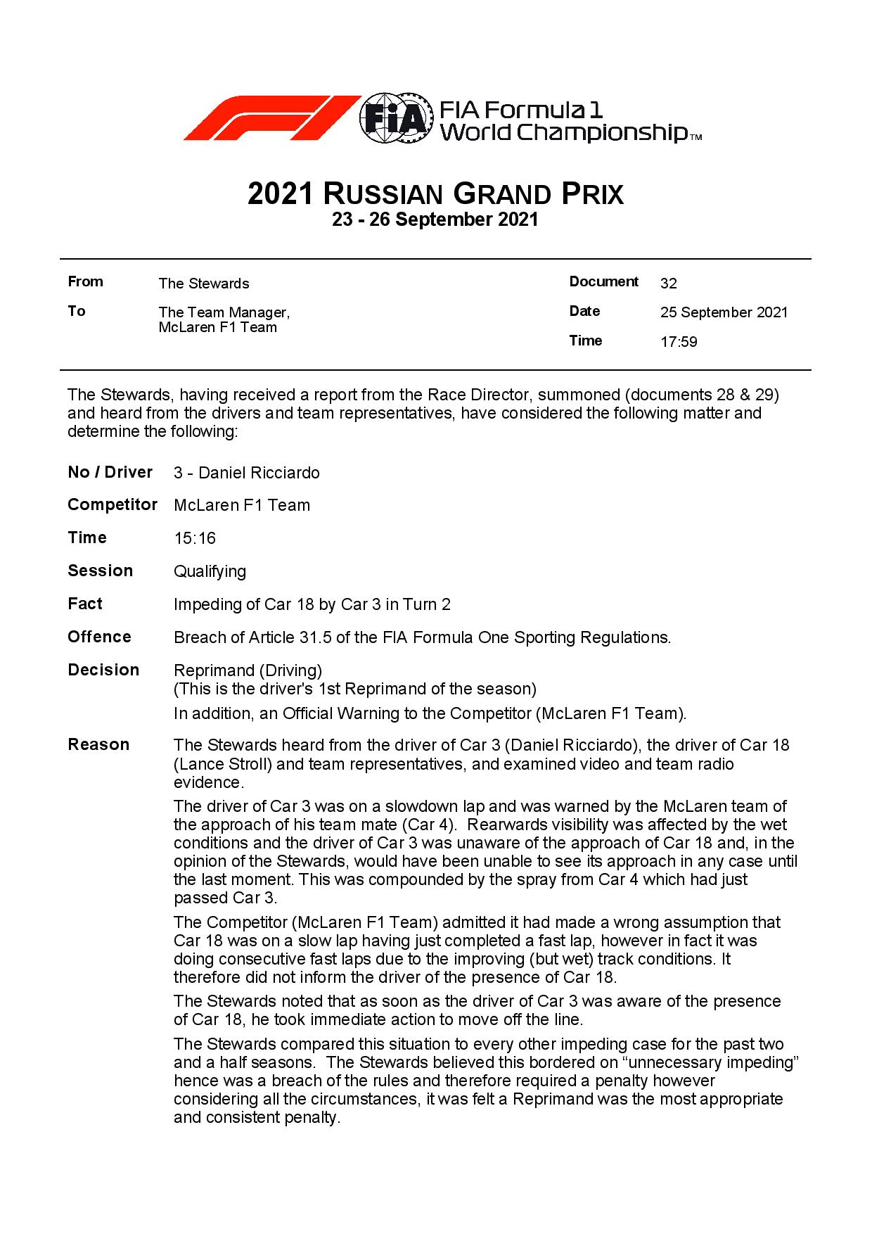 Le pilote McLaren Daniel Ricciardo a reçu une réprimande de la part des commissaires sportifs du Grand Prix de Russie ce samedi après avoir gêné l’Aston Martin de Lance Stroll durant la séance.