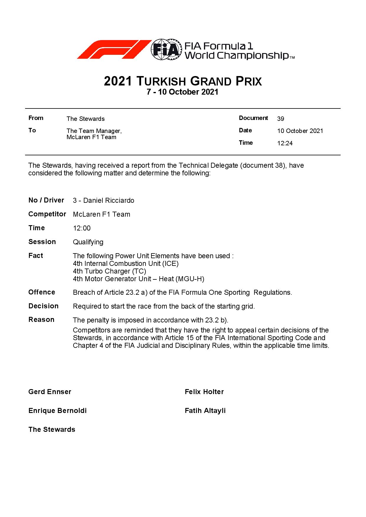 Le pilote McLaren Daniel Ricciardo a été pénalisé sur la grille de départ du Grand Prix de Turquie après avoir reçu un moteur neuf à l’arrière de sa monoplace.