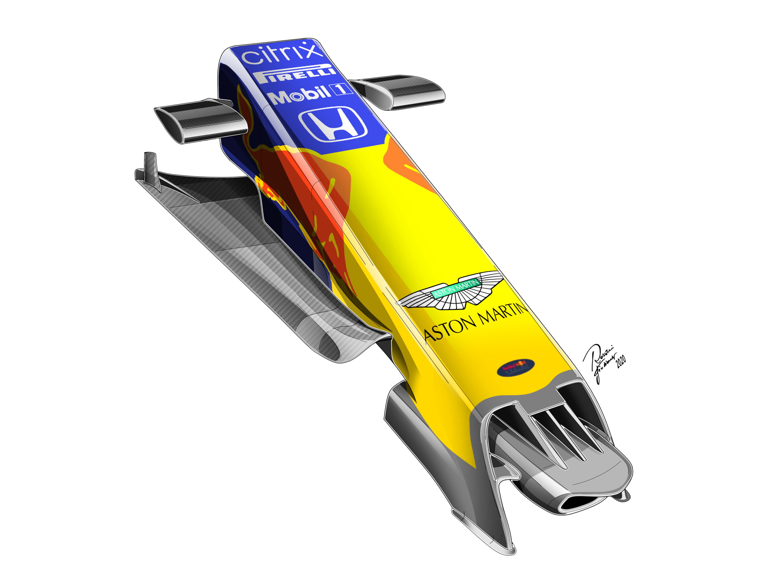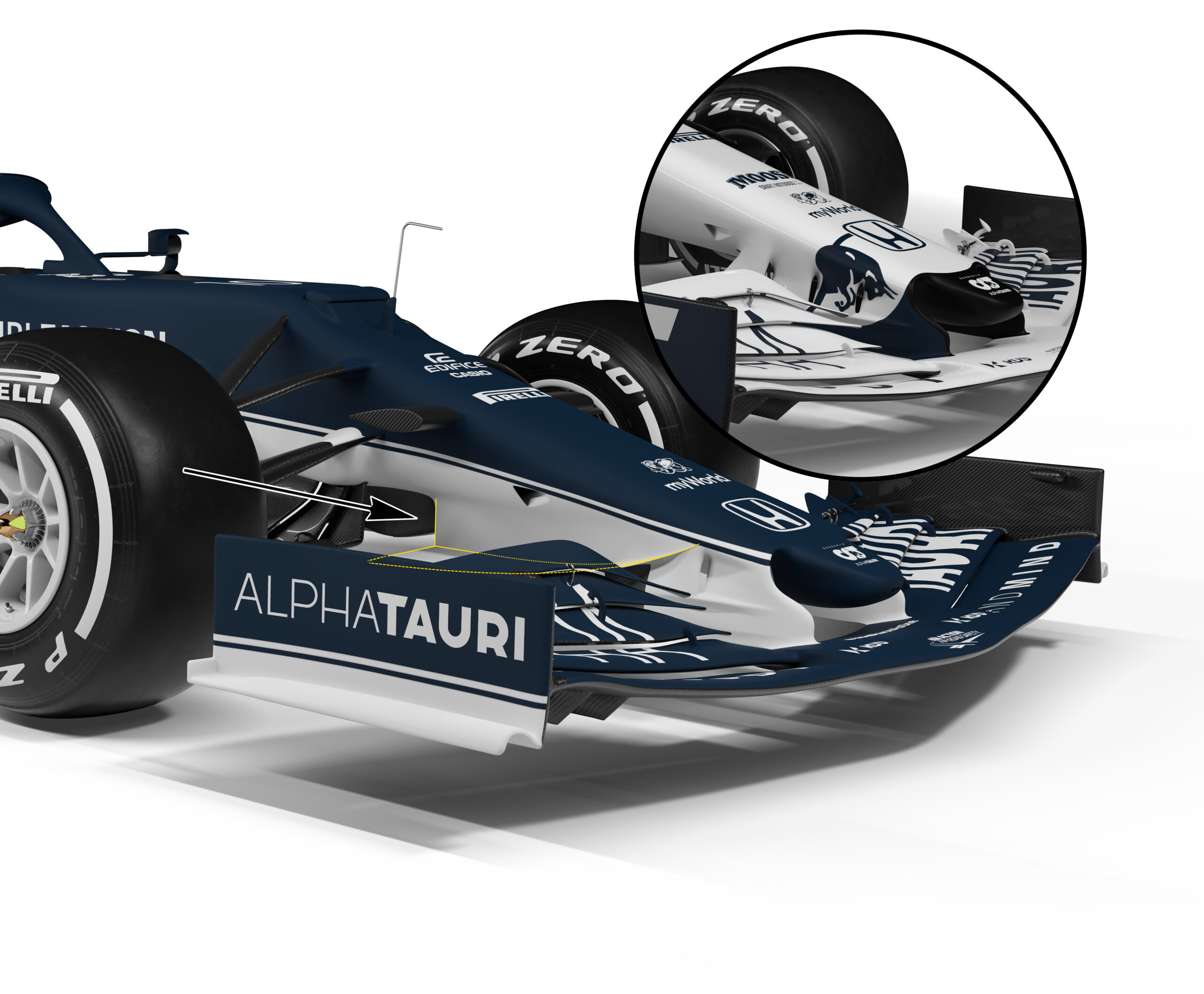 Dans les rendus de l’AT02, on peut observe un nez aux larges mâts, mais on sait que l’Alpha Tauri a approuvé une nouvelle structure d’impact avant, plus étroite pour abriter un nez plus fin similaire à celui de la RB16 de 2020 (illustration ci-dessous)