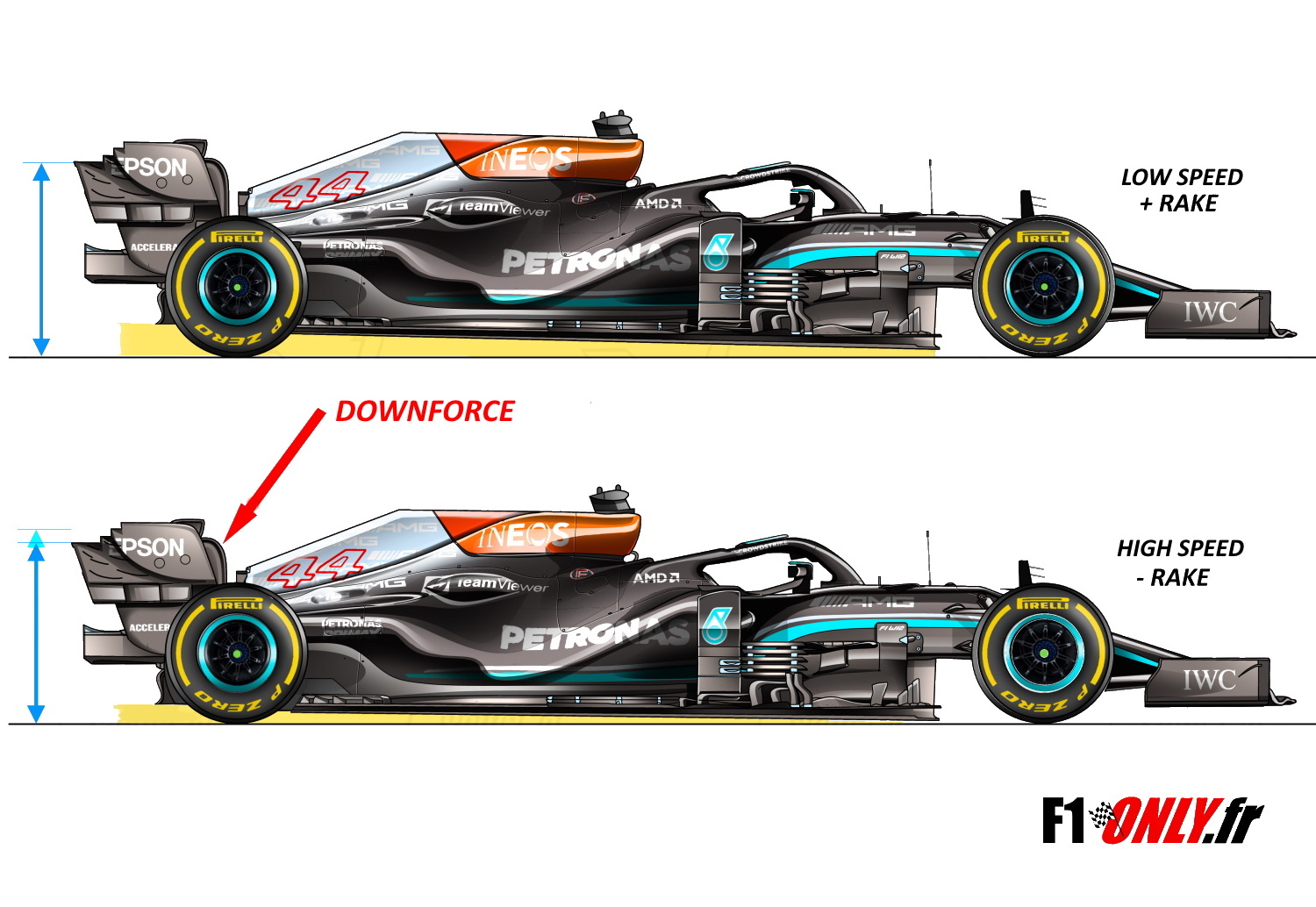En fait, le léger mouvement que l’on voit de la caméra embarquée est dû à un changement de perspective de la caméra elle-même, en raison de la configuration du rake (hauteur de caisse à l’arrière – voir le dessin plus bas) variable que Mercedes est capable d’accentuer. Il avait déjà été question en Turquie de la suspension arrière de la Mercedes et de l’écrasement de la voiture à cause de l’appui. Un comportement assez normal finalement, dû à la cinématique de la suspension arrière elle-même. Pas grâce à un système en particulier donc.