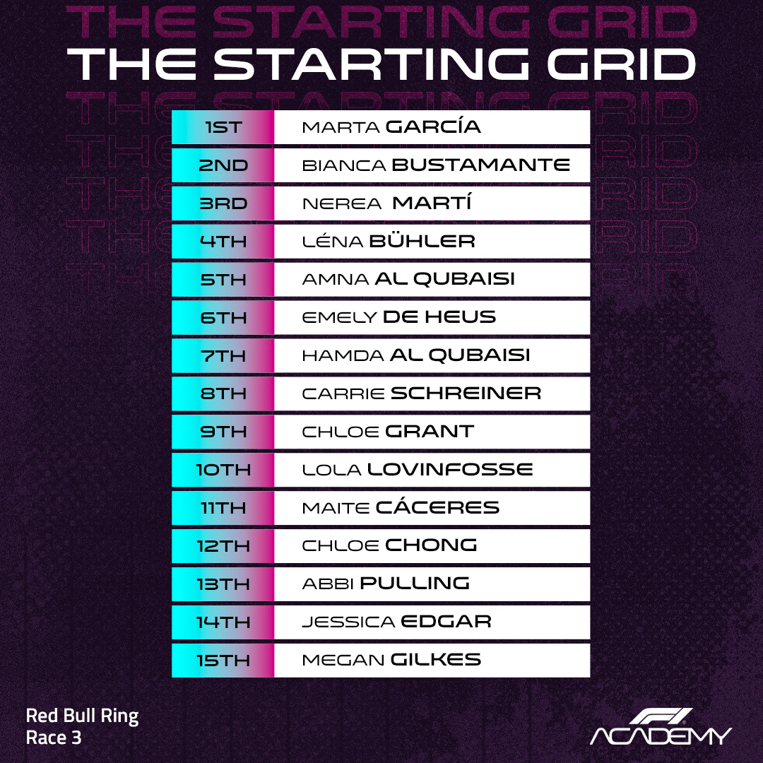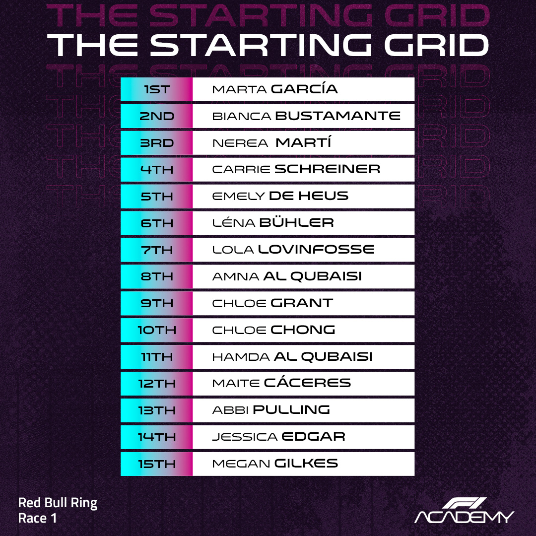 Marta García de l’équipe Prema Racing hérite de la pole position pour la course 1 et la course 3 à Spielberg, après la disqualification d’Abbi Pulling, de Jessica Edgar et de Megan Gilkes  en raison d’une infraction technique constatée sur les voitures n°10, n°11 et n°12.