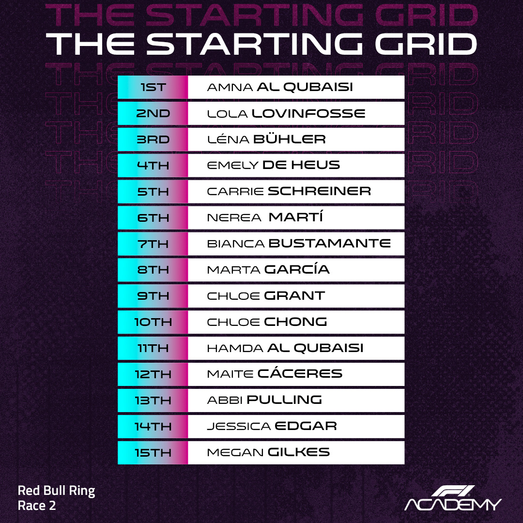 Ce samedi donc, Marta García prendra le départ des course 1 et 3 depuis la pole position en Autriche, tandis que Amna Al Qubaisi s’élancera en pole position lors de la course 2 (grille inversée) devant la Française Lola Lovinfosse (ci-dessous, vous pouvez retrouver les grilles de départ des trois courses).