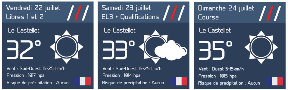 La poussée chaude provenant d’Espagne continuera d’envahir la région et c’est sous la canicule que sera donné le coup d’envoi du GP de France. Le thermomètre affichera 35°C pour l’air ambiant et la piste devrait une nouvelle fois dépasser la barre des 55°C tout au long des 53 tours de l’épreuve.