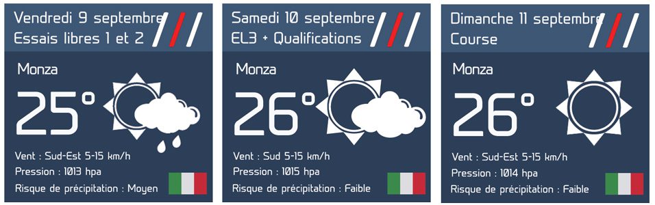C’est un temps estival qui prédominera encore pour la journée de dimanche sur la région de Monza. La course qui comporte 53 tours se déroulera sous un ciel largement ensoleillé et par des températures chaudes : 26°C dans l’air et proche de 40°C sur la piste !