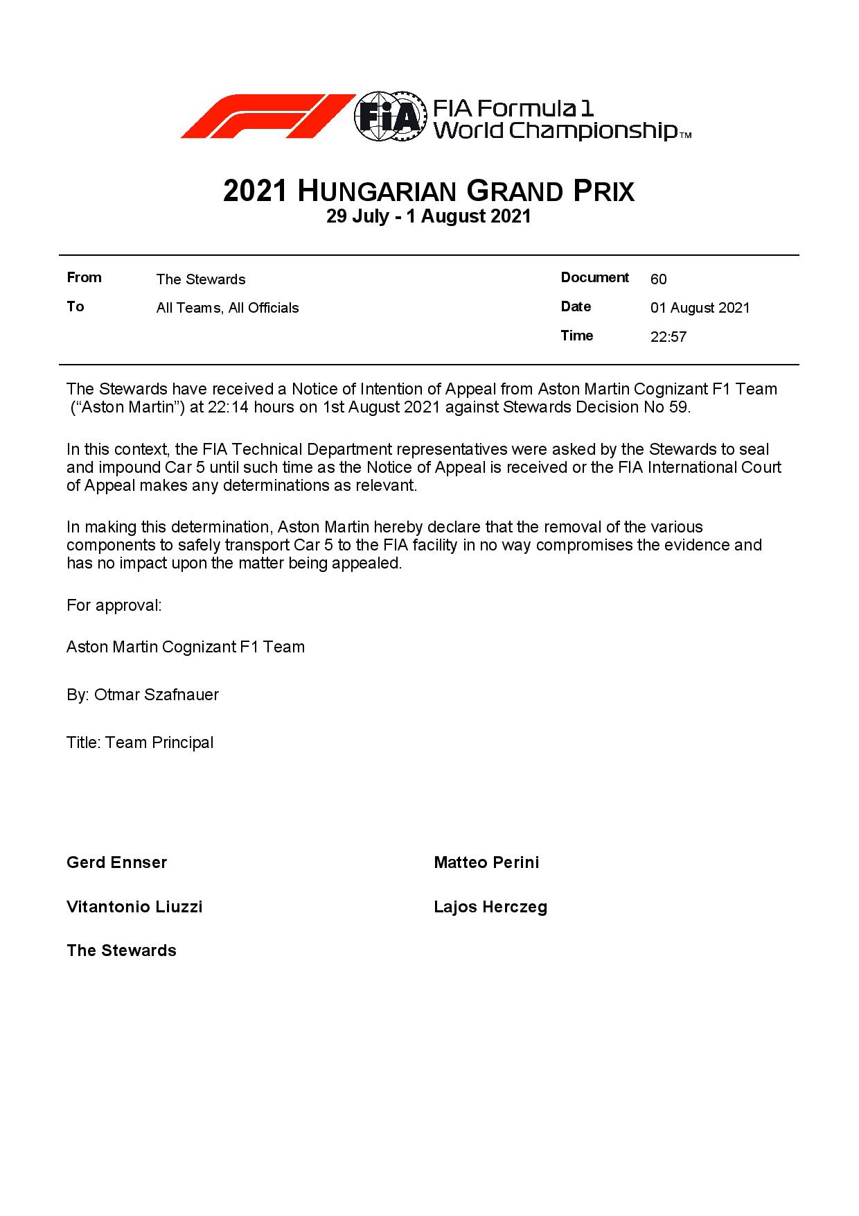 La FIA a confirmé ce dimanche soir avoir reçu un avis d’intention de faire appel de la décision n°59 des commissaires de course du GP de Hongrie qui ont disqualifié le pilote Aston martin Sebastian Vettel ce dimanche soir après l’arrivée de l’épreuve.