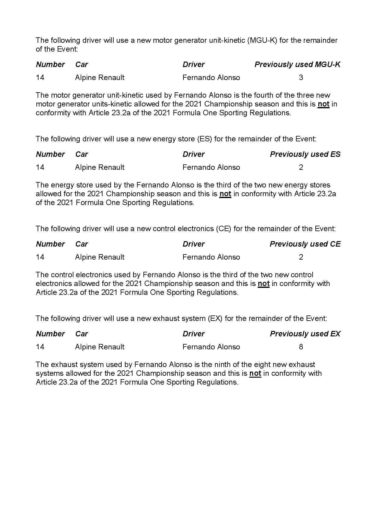 L’équipe Alpine a pris la décision ce samedi de monter un quatrième moteur neuf à l’arrière de la monoplace d’Alonso, ainsi qu’un quatrième turbo, un quatrième MGU-H, un quatrième MGU-K, une nouvelle batterie, un nouveau boîtier électronique et un nouvel échappement.