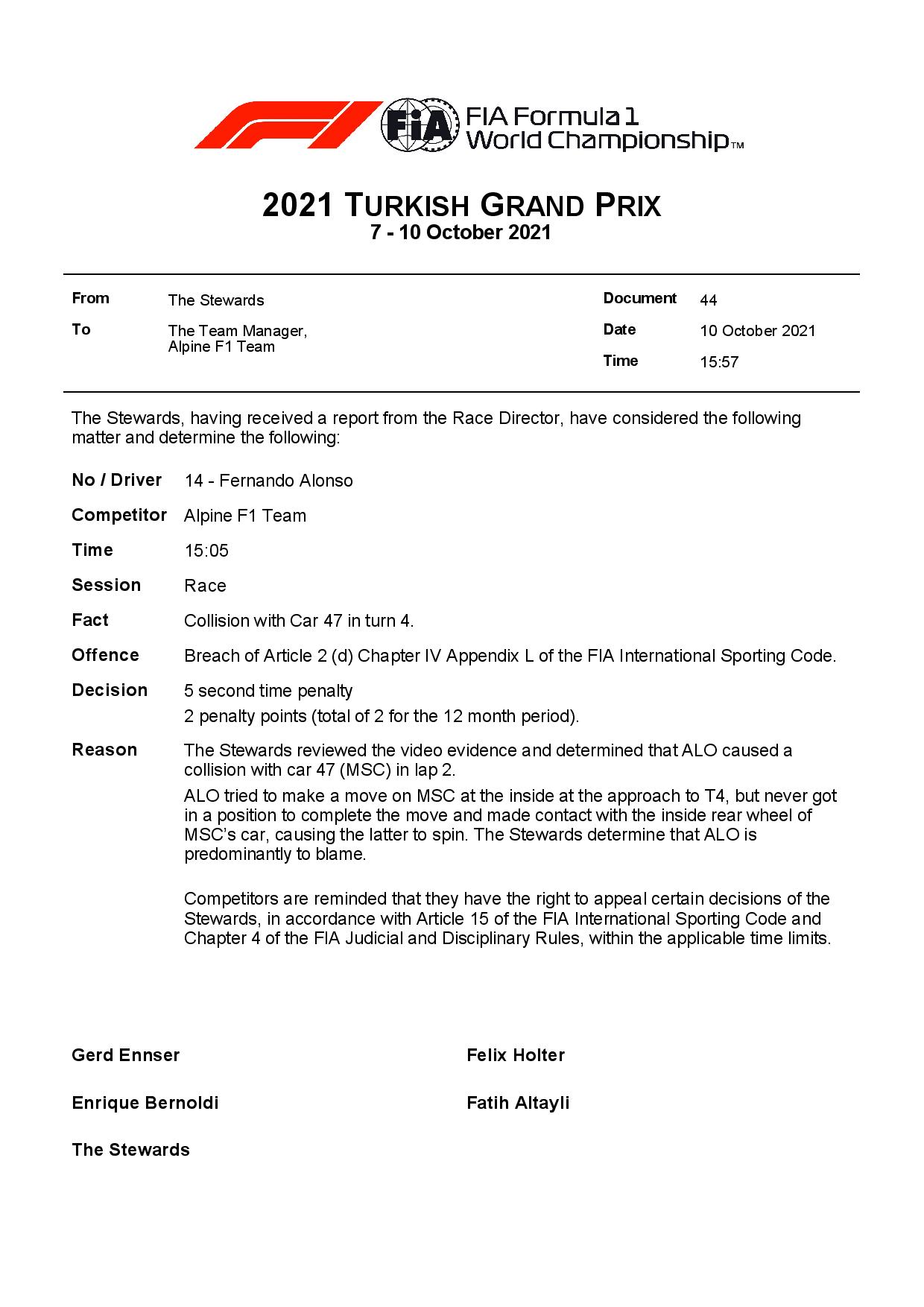Le pilote Alpine Fernando Alonso a écopé d’une double pénalité ce dimanche au Grand Prix de Turquie, seizième manche du championnat du monde de F1.