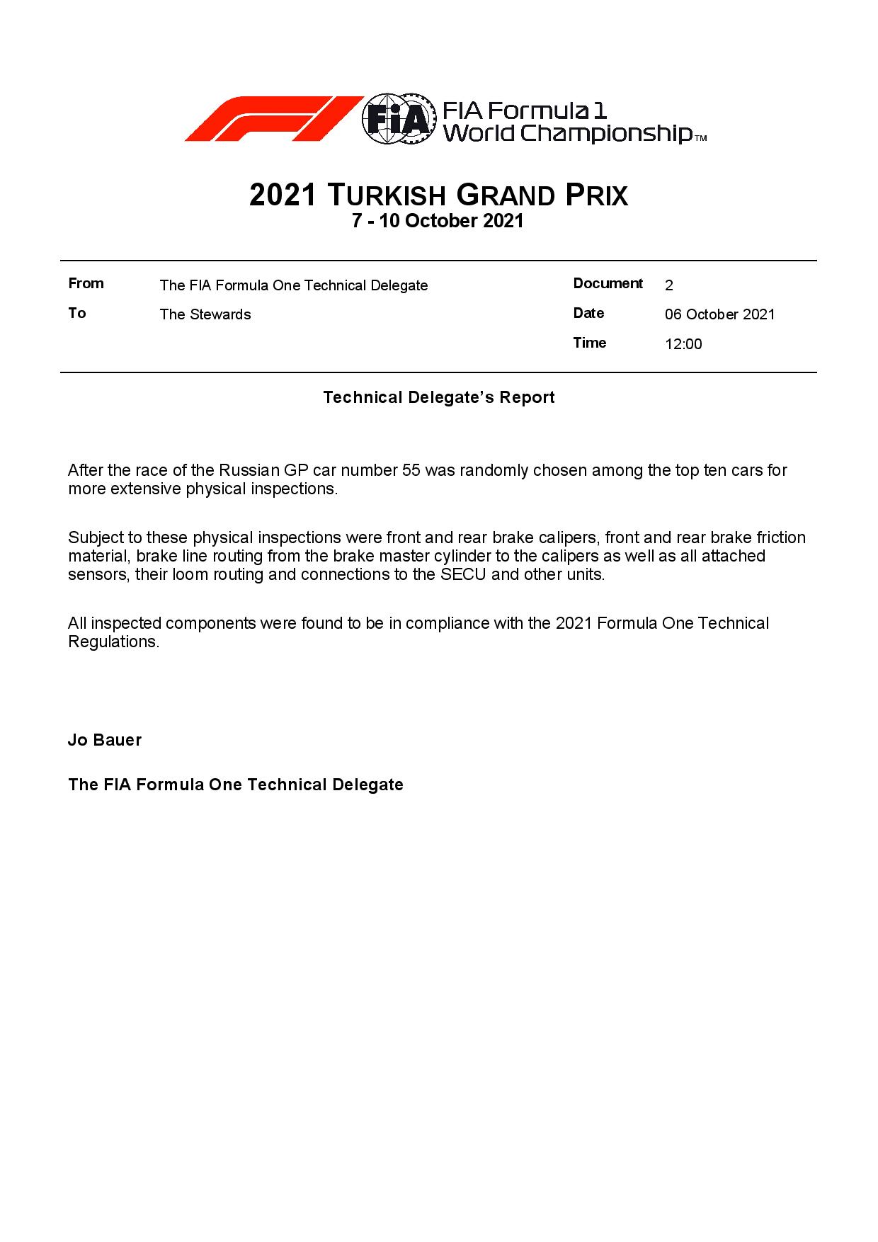 « Après la course du GP de Russie, la voiture numéro 55 a été choisie au hasard parmi les dix meilleures voitures pour des inspections physiques plus poussées. » peut-on lire dans le rapport de la FIA.