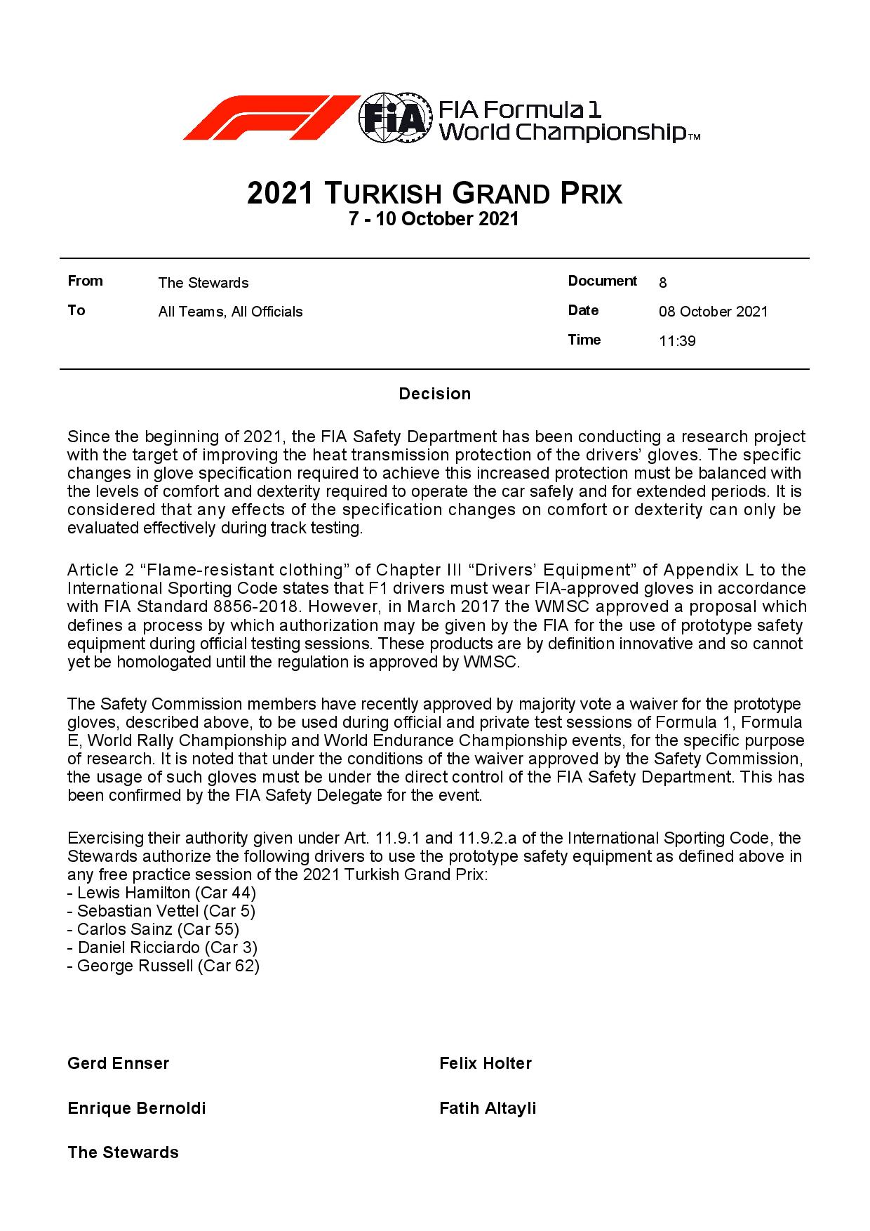 « Les Commissaires Sportifs autorisent les pilotes suivants à utiliser le prototype d’équipement de sécurité tel que défini ci-dessus dans toute séance d’essais libres du Grand Prix de Turquie. » confirme ainsi la FIA.