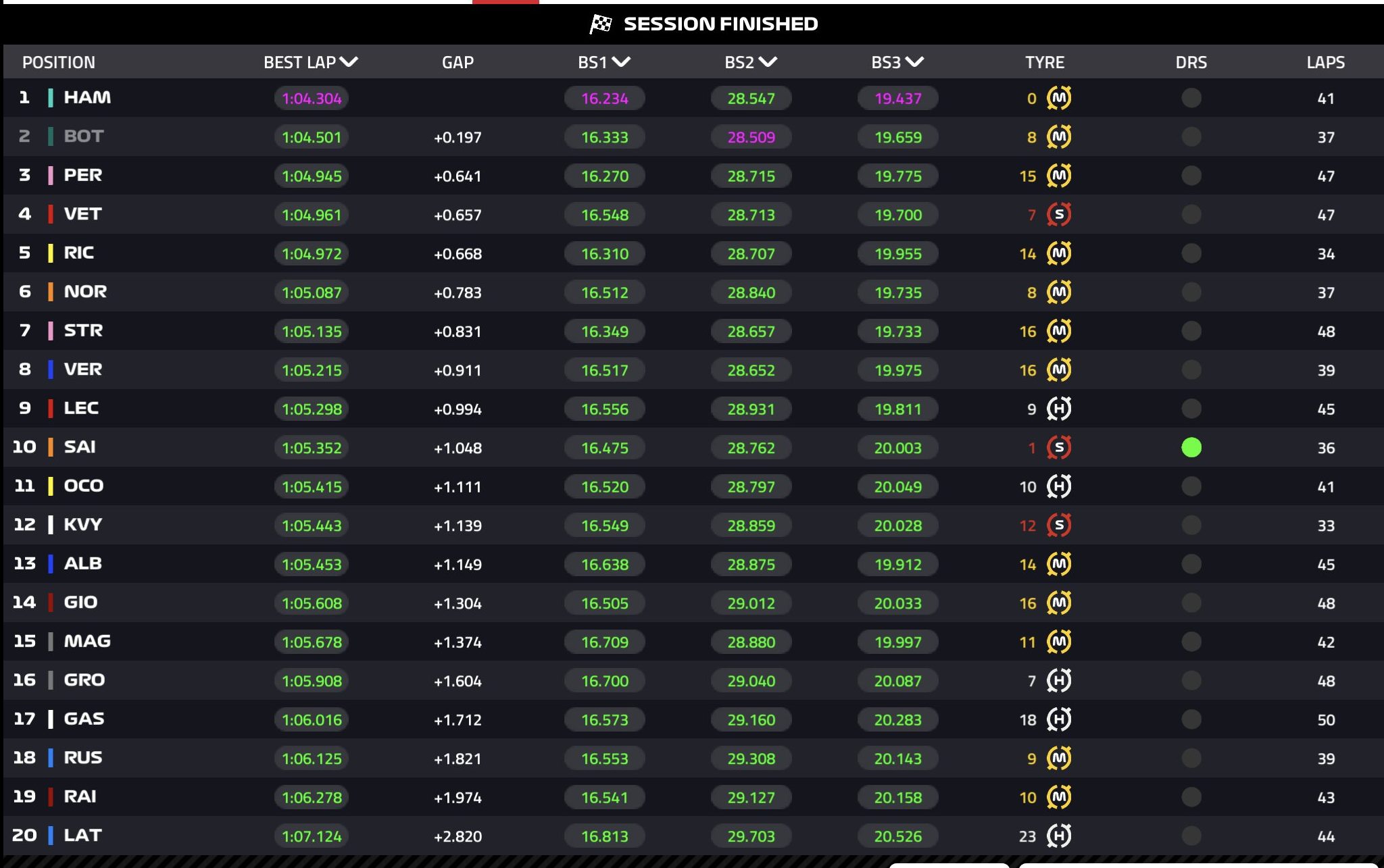 Le sextuple champion du monde devance, comme ce matin en EL1, son coéquipier Valtteri Bottas pour un peu plus d’un dixième (+0.197), alors que Sergio Perez (+0.641) a placé sa Racing Point en troisième position à un peu plus de six dixièmes de la Mercedes d’Hamilton.