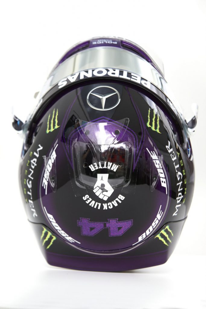 Outre la couleur Noire comme base, le logo du mouvement Black Lives Matter figure désormais au sommet du casque du pilote Mercedes.