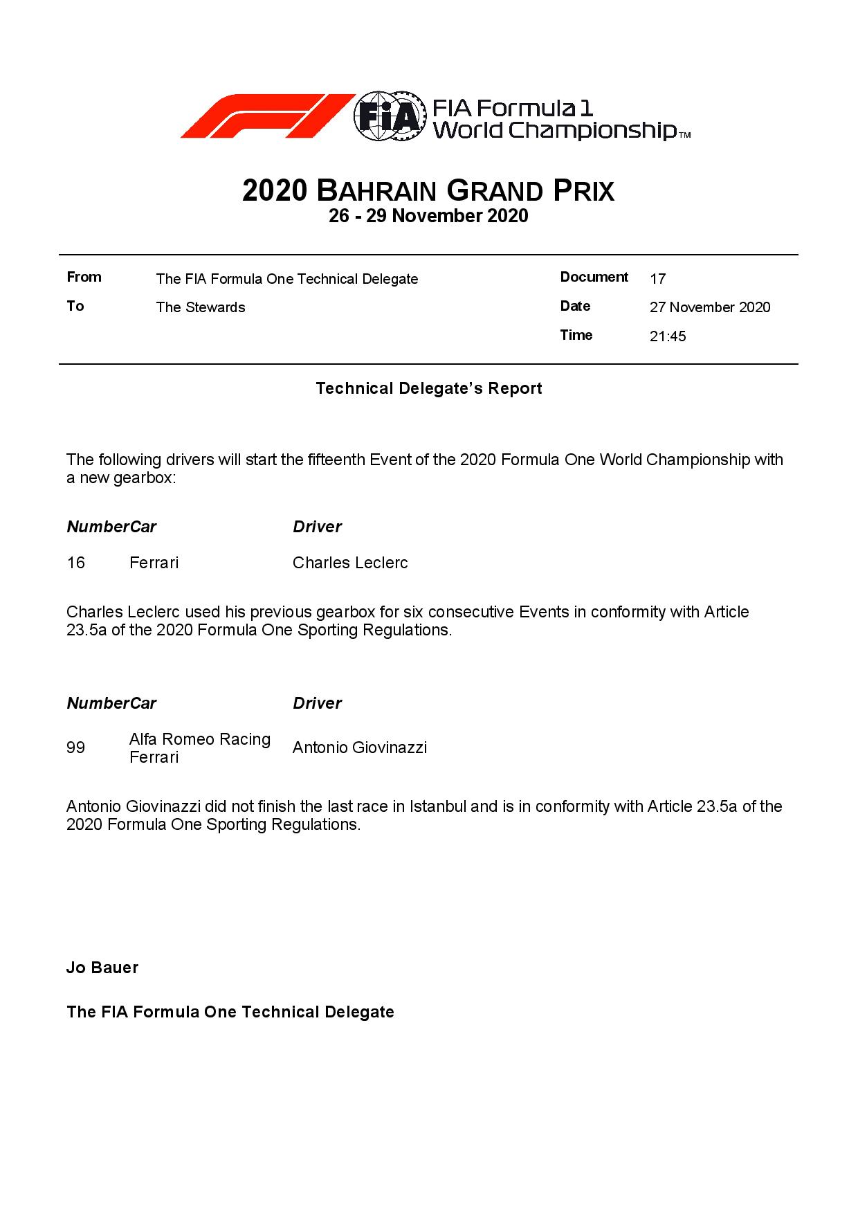 Notez également qu’Antonio Giovinazzi a reçu un moteur à combustion interne neuf pour le Grand Prix de Bahreïn, mais là encore, l’Italien respecte son quota de pièces neuve pour la saison et n’écopera donc d’aucune pénalité.