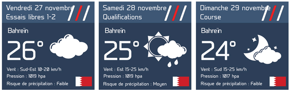La première journée de roulage se déroulera sous un ciel couvert avec très peu de chance de voir le soleil. Les températures évolueront entre 24°C et 26°C et le vent soufflera de façon modérée entre 10 et 20 km/h du secteur Sud-Est sur le circuit International de Sakhir.  Le risque de précipitation est faible.