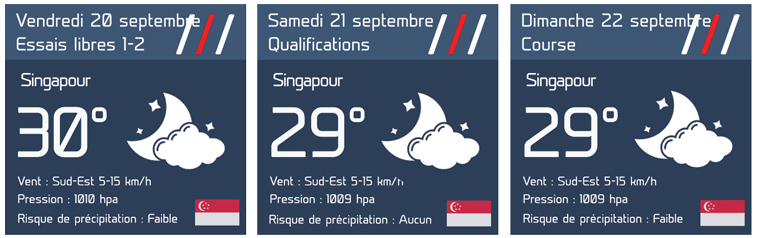 Si vous souhaitez obtenir les prévisions heure par heure (mise à jour deux fois par heure) pour le Grand Prix de Singapour, vous pouvez consulter le site de notre partenaire météo Celinium en cliquant sur ce lien: Celinium.