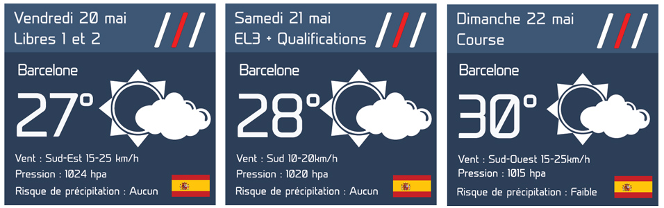 La sixième manche du championnat du monde de Formule 1 se déroule ce week-end sur le circuit de Barcelone. Avec le retour en Europe et après 5 courses (et surtout grâce à la proximité des usines), la quasi-totalité des écuries introduiront de nouvelles pièces pour cette course. Mais quelles sont les conditions météorologiques qui attendent les pilotes ce week-end? Voici le bulletin météo complet.
