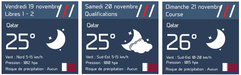 Le vent soufflera de façon modérée (entre 5 et 20 km/h) en soirée et ne devrait pas gêner le comportement des monoplaces ni déposer de grande quantité de sable sur la piste. Rappelons que Pirelli mettra à disposition les gommes les plus dures (à savoir C1, C2, C3) pour cette première édition du GP du Qatar. Bien entendu, il n’y aucun risque de précipitation pour ces trois jours.