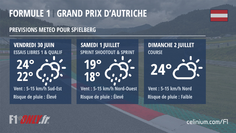 La journée de dimanche débute par un temps encore couvert avec quelques éclaircies. Durant l’après-midi, le temps s’améliore et devient nuageux avec des éclaircies. Un faible risque d’averses persiste. La température au moment où sera donné le départ de la course (15h00) avoisinera 24°C et devrait rester stable tout au long des 71 tours de l’épreuve autrichienne. Le vent soufflera du Nord entre 5 et 15 km/h.