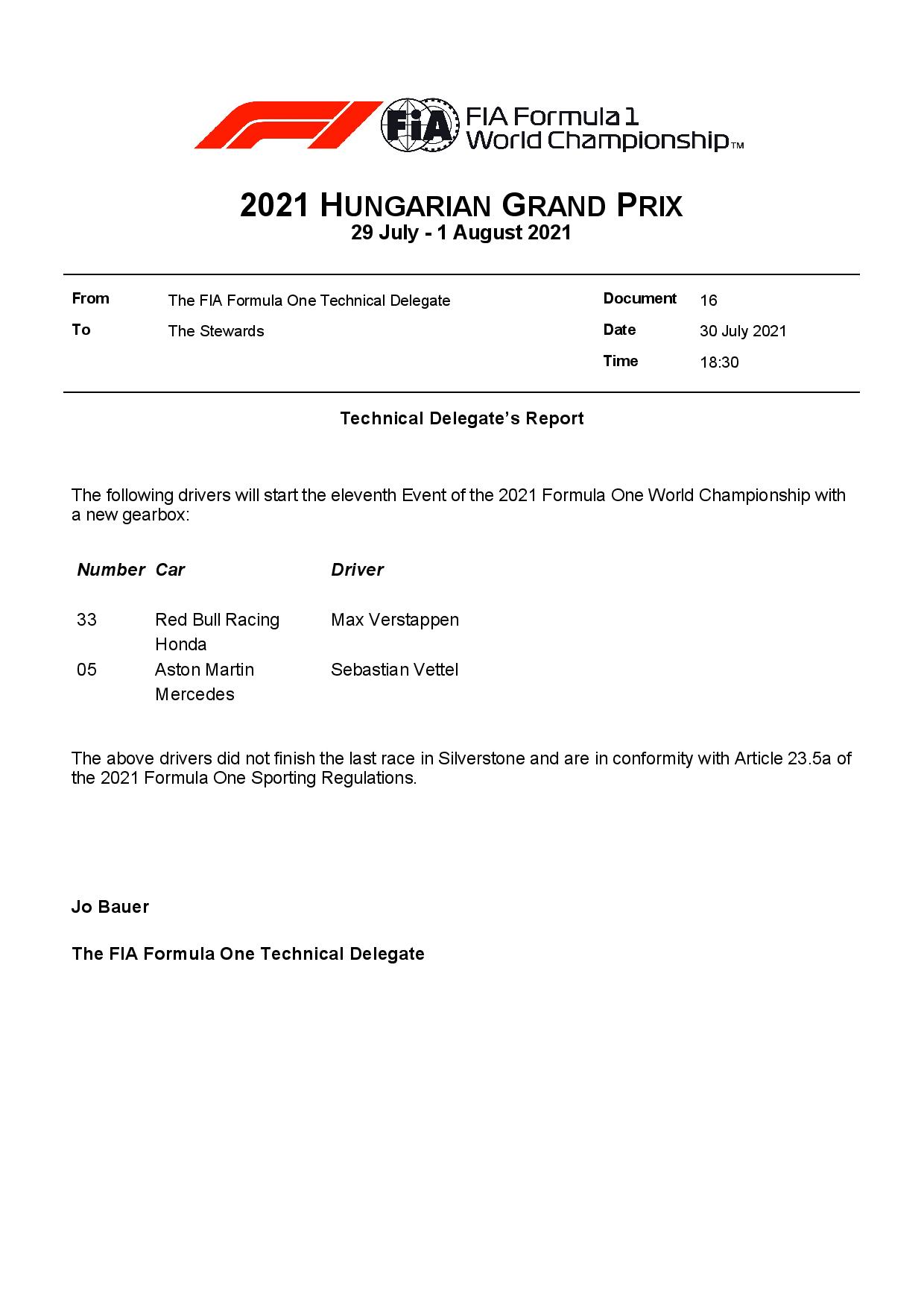 Les deux pilotes ayant abandonné lors de la dernière manche disputée à Silverstone, ils n’écoperont d’aucune pénalité sur la grille de départ en Hongrie pour ce changement de boîte de vitesses comme le stipule la réglementation.
