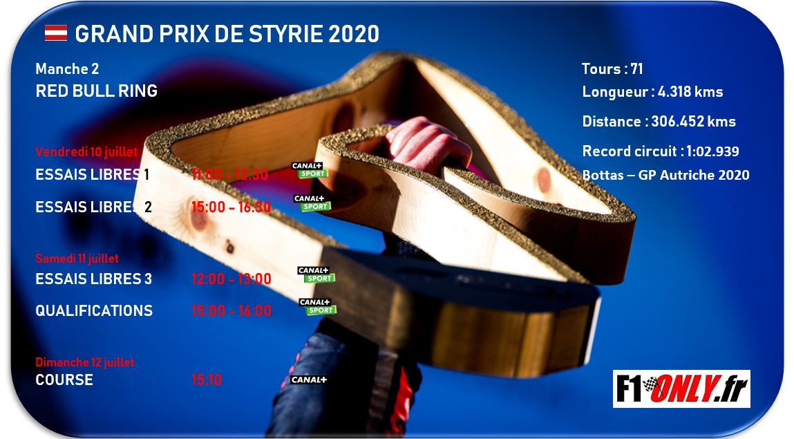 Dimanche 12 juillet : Le départ du Grand Prix de Styrie 2020 sera donné ce dimanche 12  juillet à 15h10. Les pilotes s’élanceront pour 71 tours et un peu plus de 300 km.