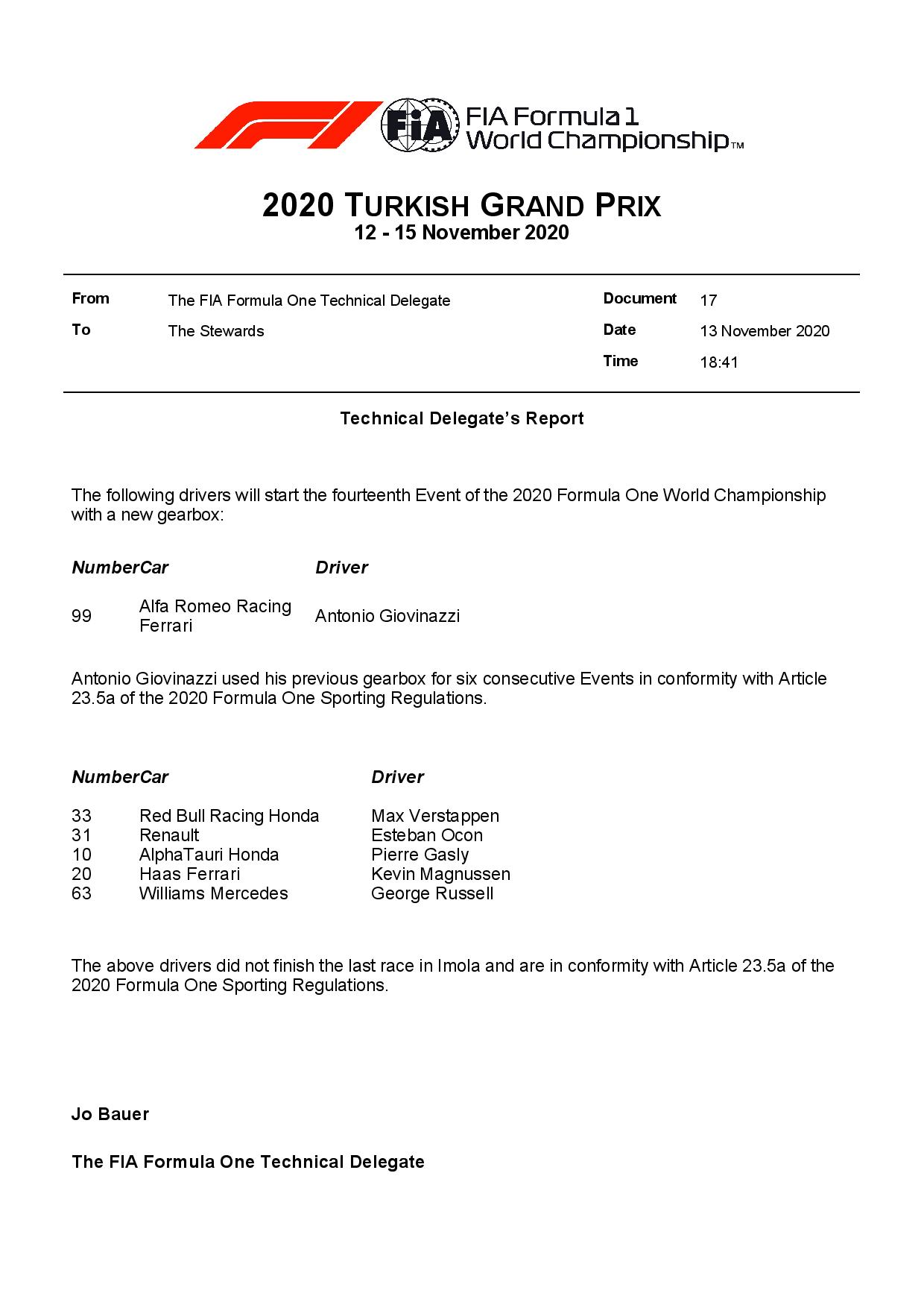 Six pilotes de F1 disposent d’une boîte de vitesses neuve ce week-end au Grand Prix de Turquie 2020, quatorzième manche de la saison 2020.