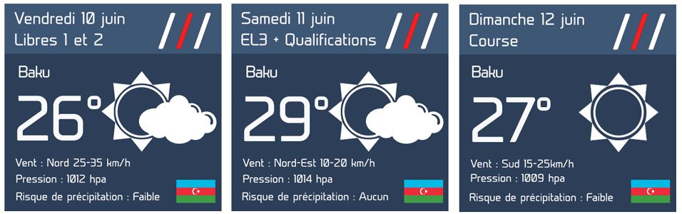 Pour la huitième course de la saison, la F1 pose ses valises ce week-end à Bakou pour le GP d’Azerbaïdjan et comme avant chaque Grand Prix, casinoenlignefrancais.co.com vous propose le bulletin météo complet pour le week-end.
