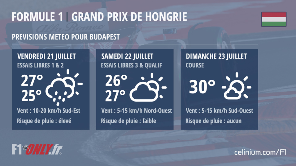 Après une matinée nuageuse à couverte, le ciel se fait de plus en plus menaçant au courant de l’après-midi et des averses orageuses sont attendues entre les deux séances d’essais libres. Le risque de pluie augmente en fin d’après-midi et en soirée. Le mercure oscille entre 27°C lors de la première séance et 25°C pour la deuxième. Au moment où les F1 seront en piste, le vent souffle du secteur Sud-Est entre 10 et 20 km/h. Occasionnellement, des rafales atteignant 30 km/h peuvent traverser la région de Budapest.