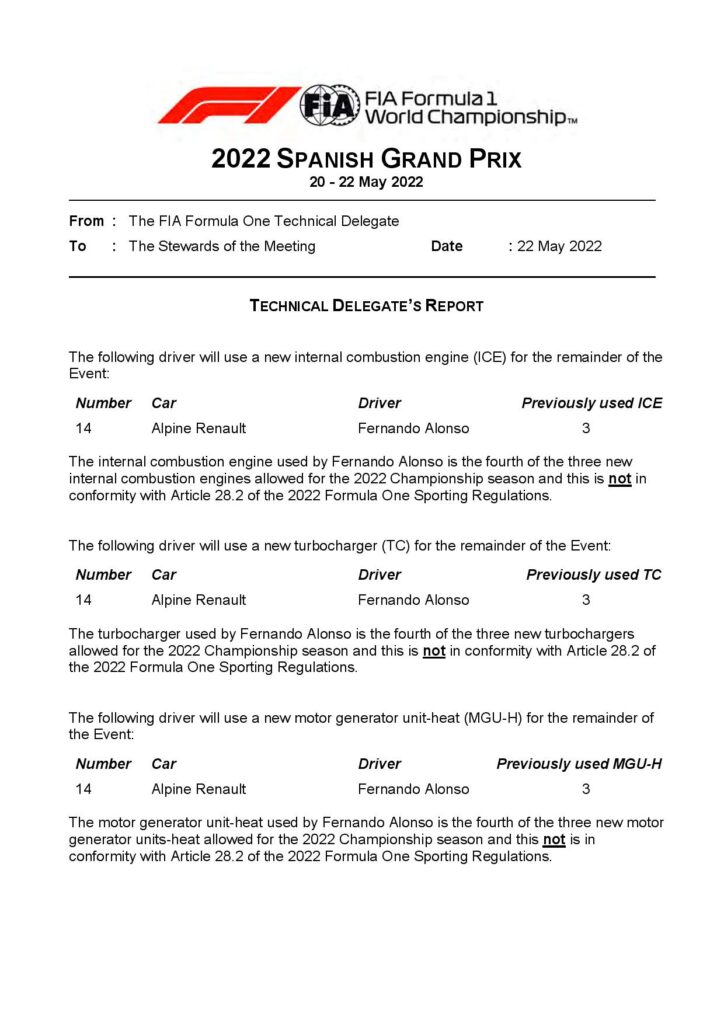 En raison de la position de Fernando Alonso sur la grille de départ ce dimanche en Espagne (dix-septième), Alpine a décidé de monter une quatrième unité de puissance neuve à l’arrière de sa monoplace, ce qui veut dire que le double champion du monde écope d’une pénalité de grille, l’obligeant alors à prendre le départ de la course depuis la dernière position. L’impact de cette pénalité est toutefois limité puisqu’il s’était qualifié en dix-septième place ce samedi à la suite d’un « malentendu » avec son équipe (à lire ici).