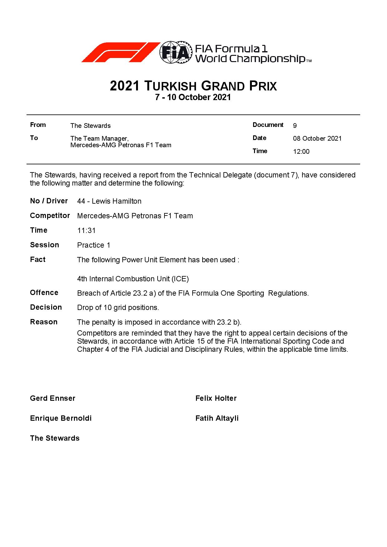 Le septuple champion du monde de F1 Lewis Hamilton a reçu une pénalité sur la grille de départ du Grand Prix de Turquie à la suite d’un changement de moteur décidé par son équipe.