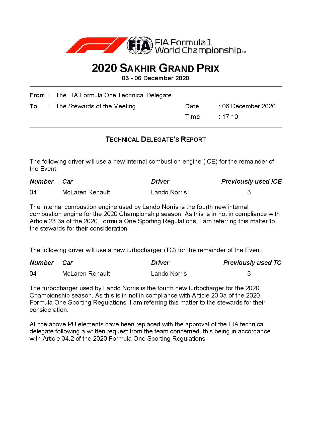 Le pilote McLaren Lando Norris devra prendre le départ du Grand Prix de Sakhir depuis le fond de la grille ce dimanche après avoir reçu de nouveaux éléments moteur sur sa monoplace.