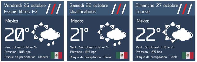La température pour la course sera de 22°C et les vents faibles (5-10 km/h) devraient souffler du secteur Sud-Ouest. Comme les averses seront localisées et donc difficiles à prévoir sur une si longue échéance, nous vous invitons à consulter les prévisions disponibles pour le Grand-Prix du Mexique sur le site de notre partenaire météo Celinium.
