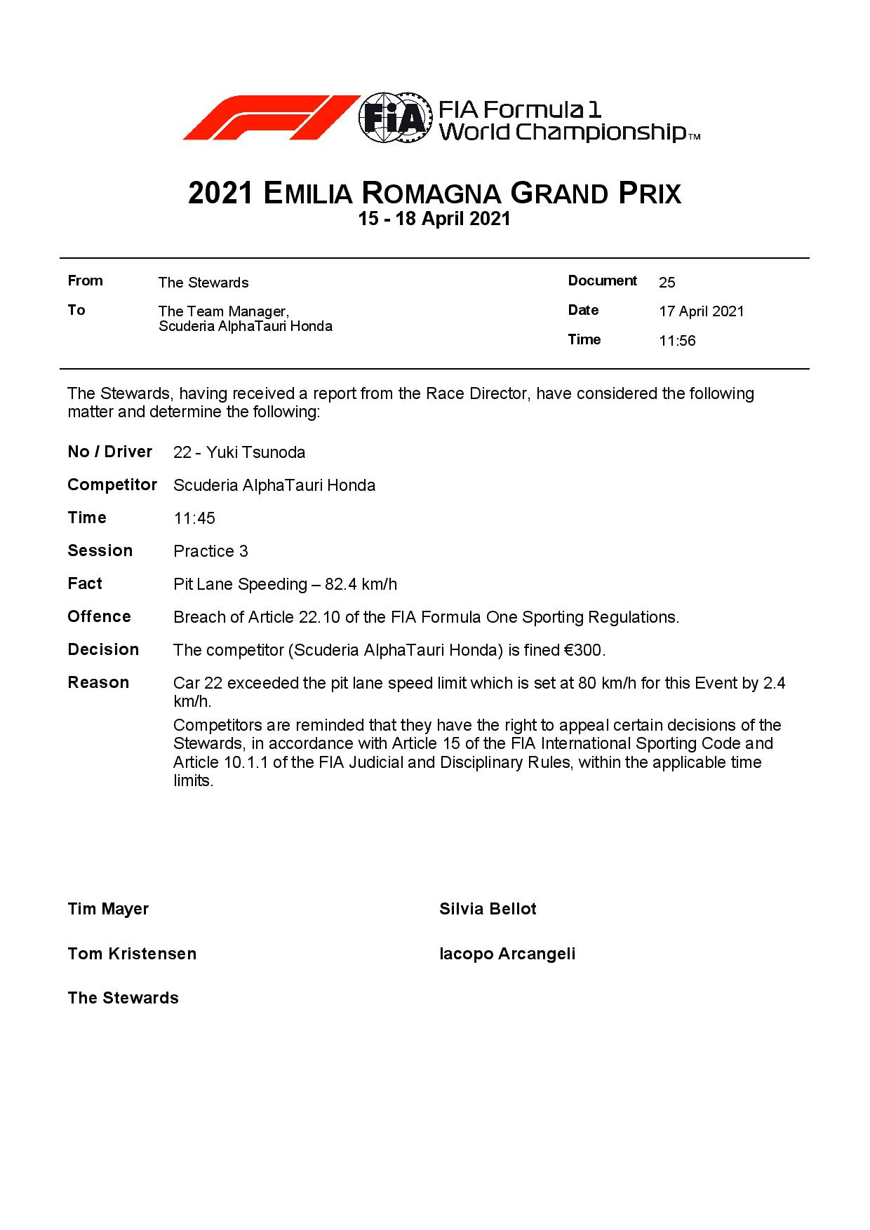 L’équipe AlphaTauri a écopé d’une amende ce samedi à Imola en raison d’un excès de vitesse dans la voie des stands de la part du Japonais Yuki Tsunoda.