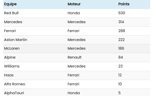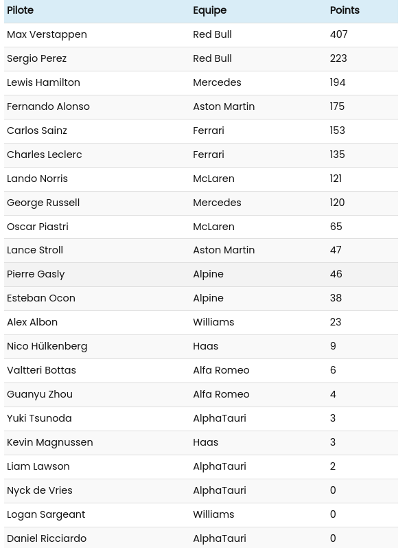 Les classements présentés ci-dessous sont évolutifs en temps réel et sont donc mis à jour en cas de pénalité infligée à un ou plusieurs pilotes après le classement officiel de la course et qui aurait une conséquence directe sur les positions aux championnats.