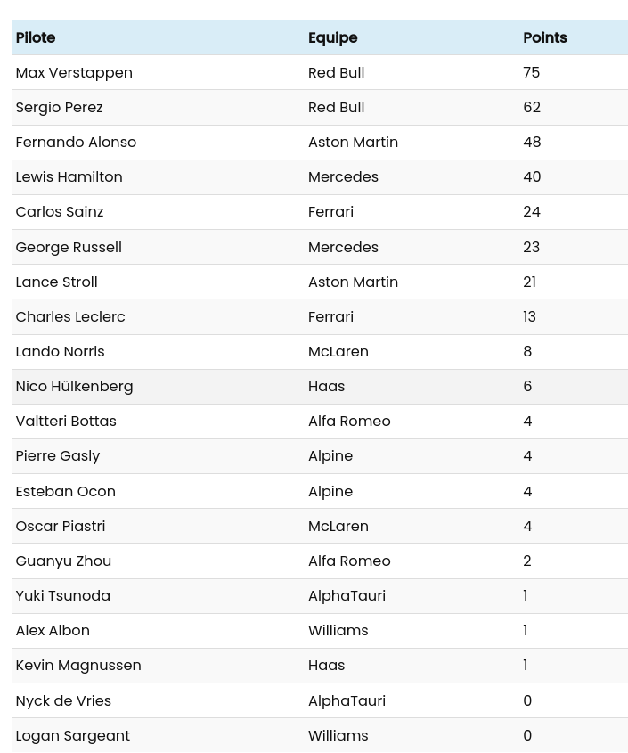 Derrière, George Russell, Carlos Sainz, Fernando Alonso, Lewis Hamilton et Lance Stroll complètent le top huit de cette première course Sprint de l’année où seuls les huit premiers marquent des points au championnat.