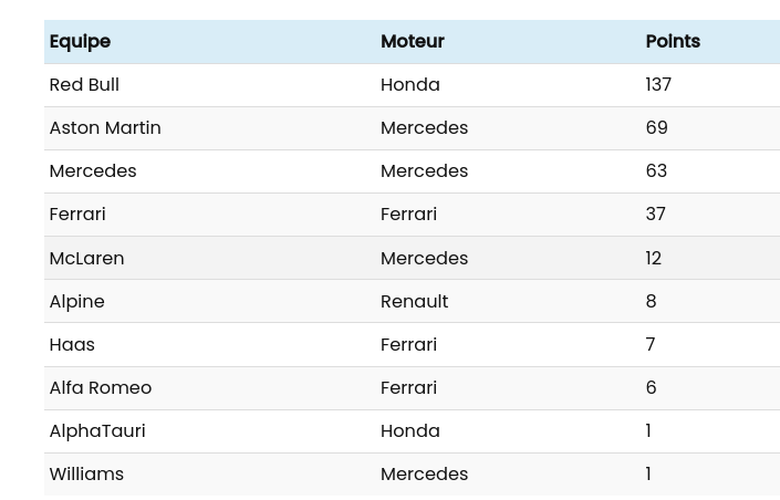 Les classements présentés ci-dessous sont évolutifs en temps réel et sont donc mis à jour en cas de pénalité infligée à un ou plusieurs pilotes après le classement officiel de la course et qui aurait une conséquence directe sur les positions aux championnats.