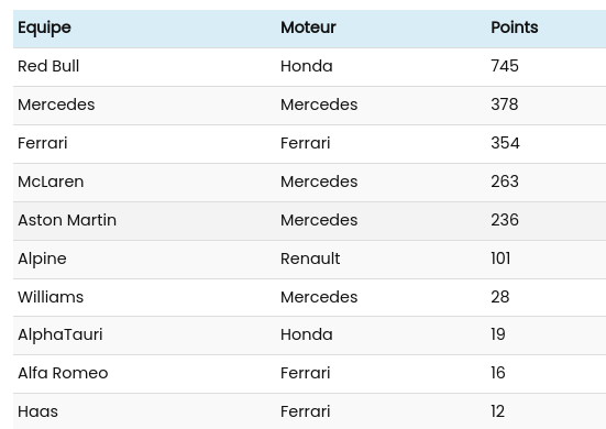 Les classements présentés ci-dessous sont évolutifs en temps réel et sont donc mis à jour en cas de pénalité infligée à un ou plusieurs pilotes après le classement officiel de la course et qui aurait une conséquence directe sur les positions aux championnats.