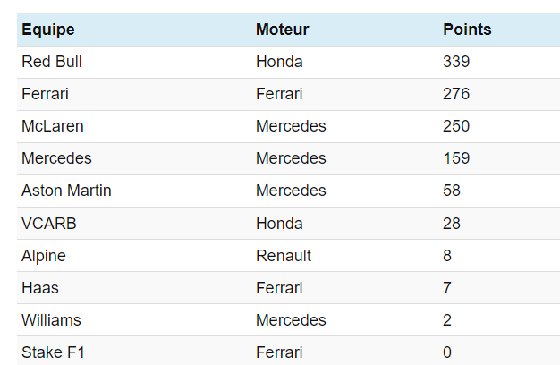 Les classements présentés ci-dessous sont évolutifs en temps réel et sont donc mis à jour en cas de pénalité infligée à un ou plusieurs pilotes après le classement officiel de la course et qui aurait une conséquence directe sur les positions aux championnats.