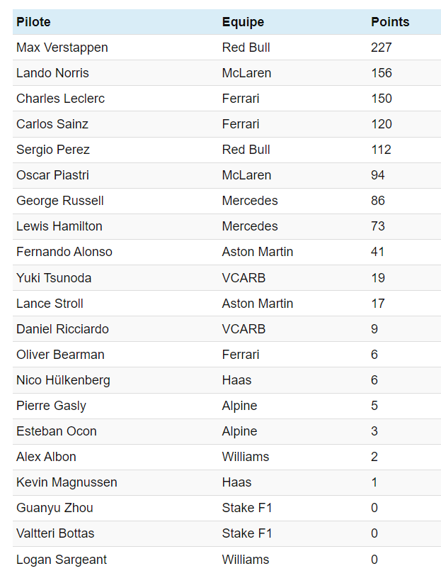 Voici les classements F1 2024 pilotes et constructeurs après la course Sprint du Grand Prix d’Autriche disputée ce samedi 29 juin sur le tracé Red Bull Ring de Spielberg.
