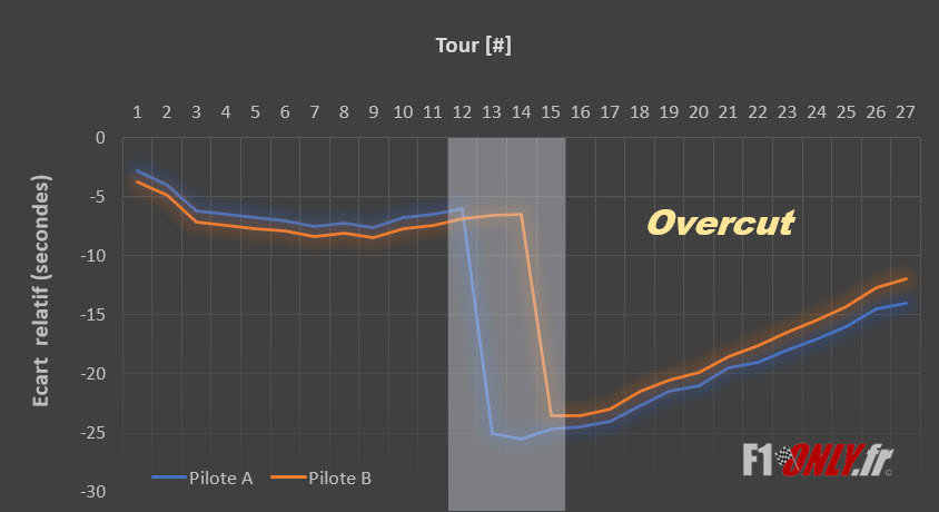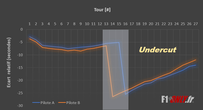 - L’undercut consiste à s’arrêter aux stands avant un concurrent direct dans l’espoir de profiter de pneus plus performants pour gagner du temps sur lui, tandis qu’il continue à rouler avec des pneus usés. Dans l’illustration ci-dessous, le pilote B (orange) s’arrête pour chausser de nouveaux pneus tandis que le pilote A (bleu) reste en piste. Le pilote B profitant des pneus frais, enchaîne des tours plus rapides que son concurrent immédiat qui perd du temps sur son vieux train de pneus. Le pilote A effectue finalement son arrêt et son retour en piste se retrouve derrière le pilote B. On dit alors que le pilote B a réussi l’undercut.