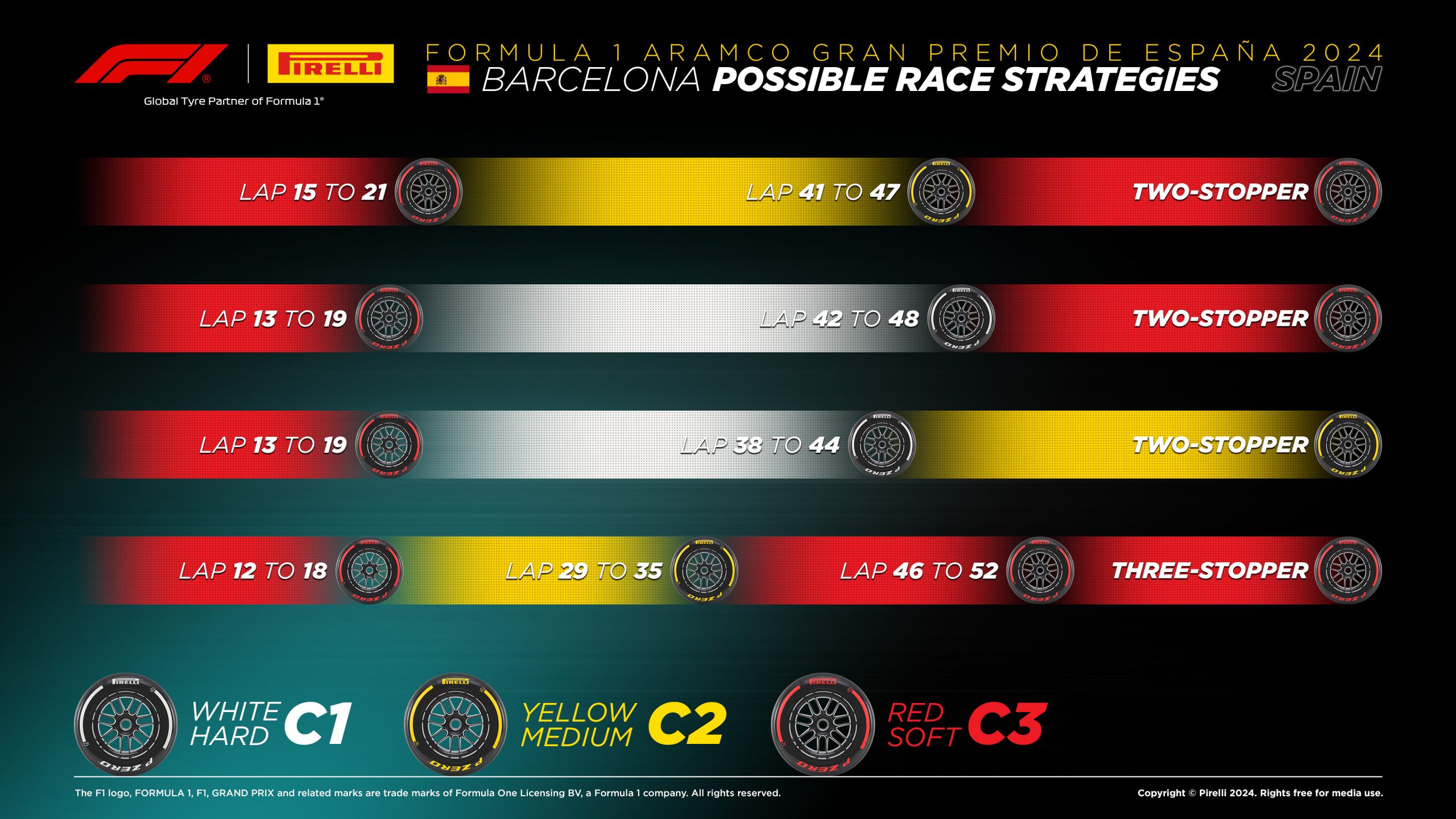 Illustration : simulation de stratégies possibles fournie par Pirelli pour le GP d’Espagne 2024