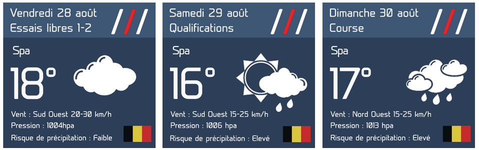 A noter que le circuit de Spa est le plus long du calendrier (7 km) et si certaines parties du circuit sont sèches, d’autres peuvent être humides. D’ailleurs les écuries n’hésitent pas à déployer des membres de leur personnel autour du circuit afin de rapporter tout changement météo. Les températures resteront fraîches avec un maximum de 16°C et le vent, modéré entre 15 et 25km/h, sera toujours du secteur Sud-Ouest.